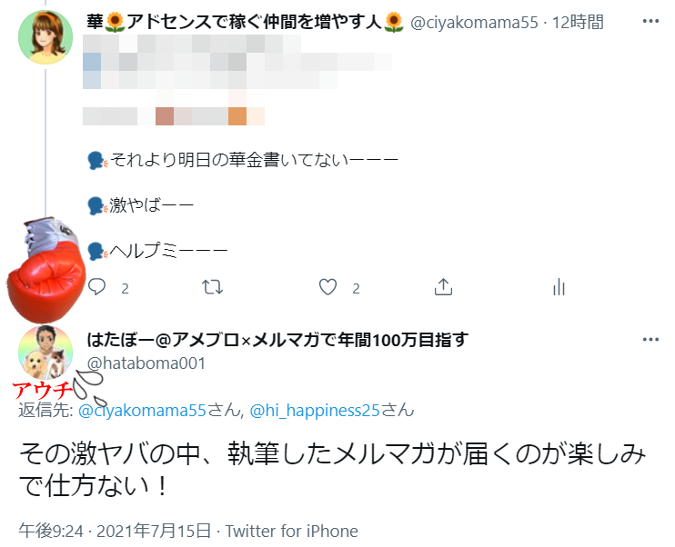 — ひろみ🍻月5時間で5万円稼ぐ˙˚ʚ♡ɞ˚˙ (@hi_happiness25) July 9, 2021